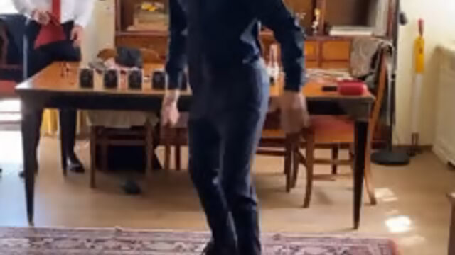 Лысый мужчина шпёхает брюнетку посреди кухни
